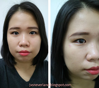 This is actually my face without any foundation. I have my eyebrow, eyes and lips makeup done beforehand but there is no primer nor concealer on my face. As you can see, I have some breakouts around my temple, hyperpigmentation around the nose and a pimple by the lower lips.